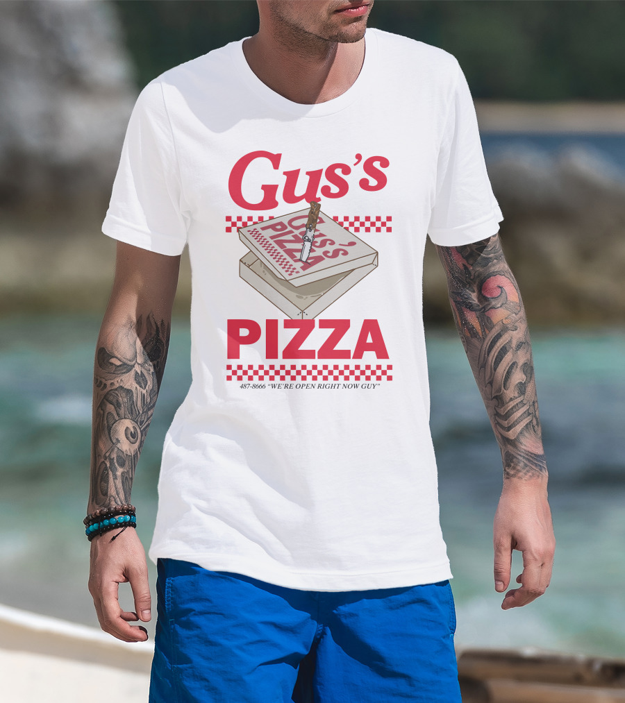 Gus's Pizza Box Knife 487-8666 We're Open Right Now Guy T-Shirt