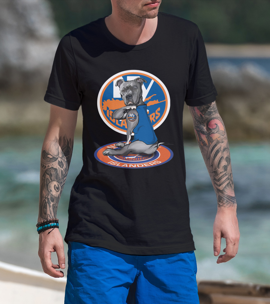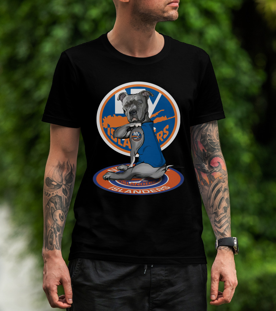 NY Islanders Dog Wearing Team Logo With Circular Orange T-Shirt