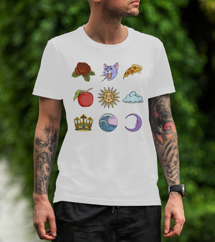 Rose Cat Pizza Apple Sun Cloud Crown Wave Moon T-Shirt