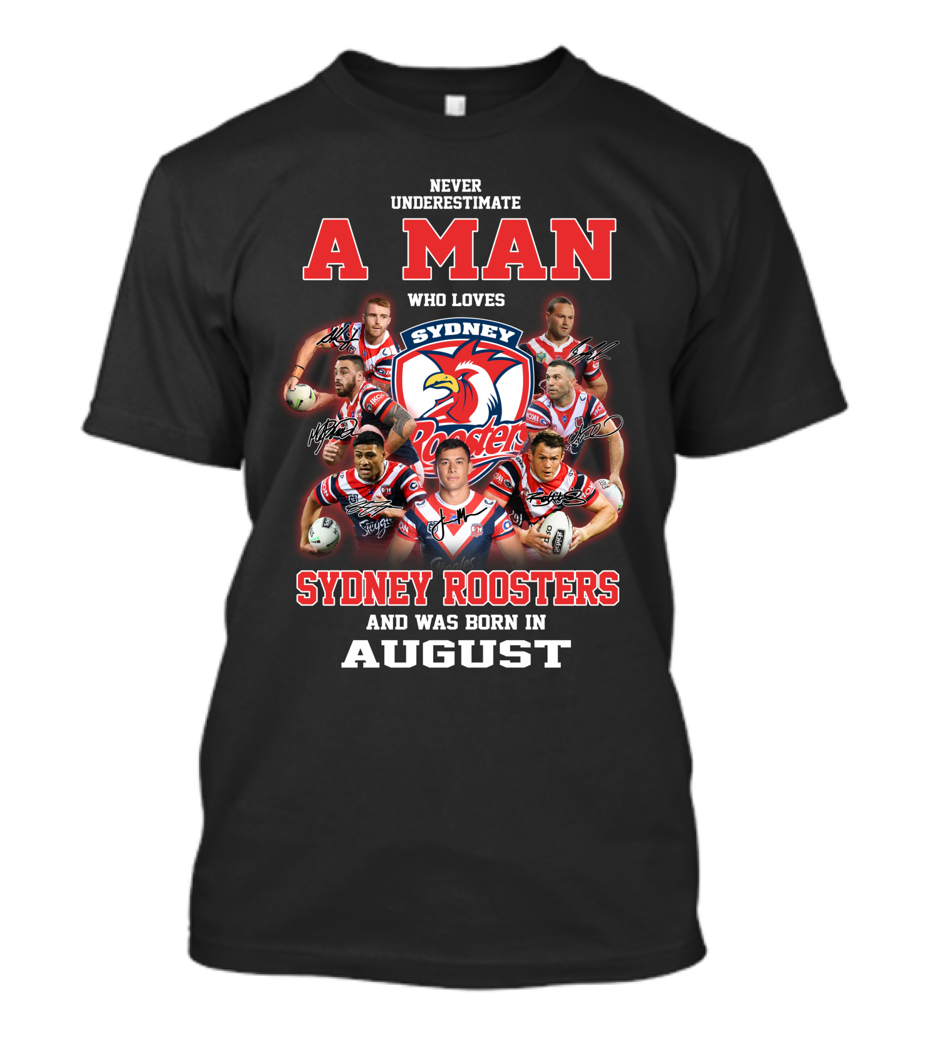 Never Underestimate A Man Who Loves Sydney Roosters And Was Born In August T-Shirt