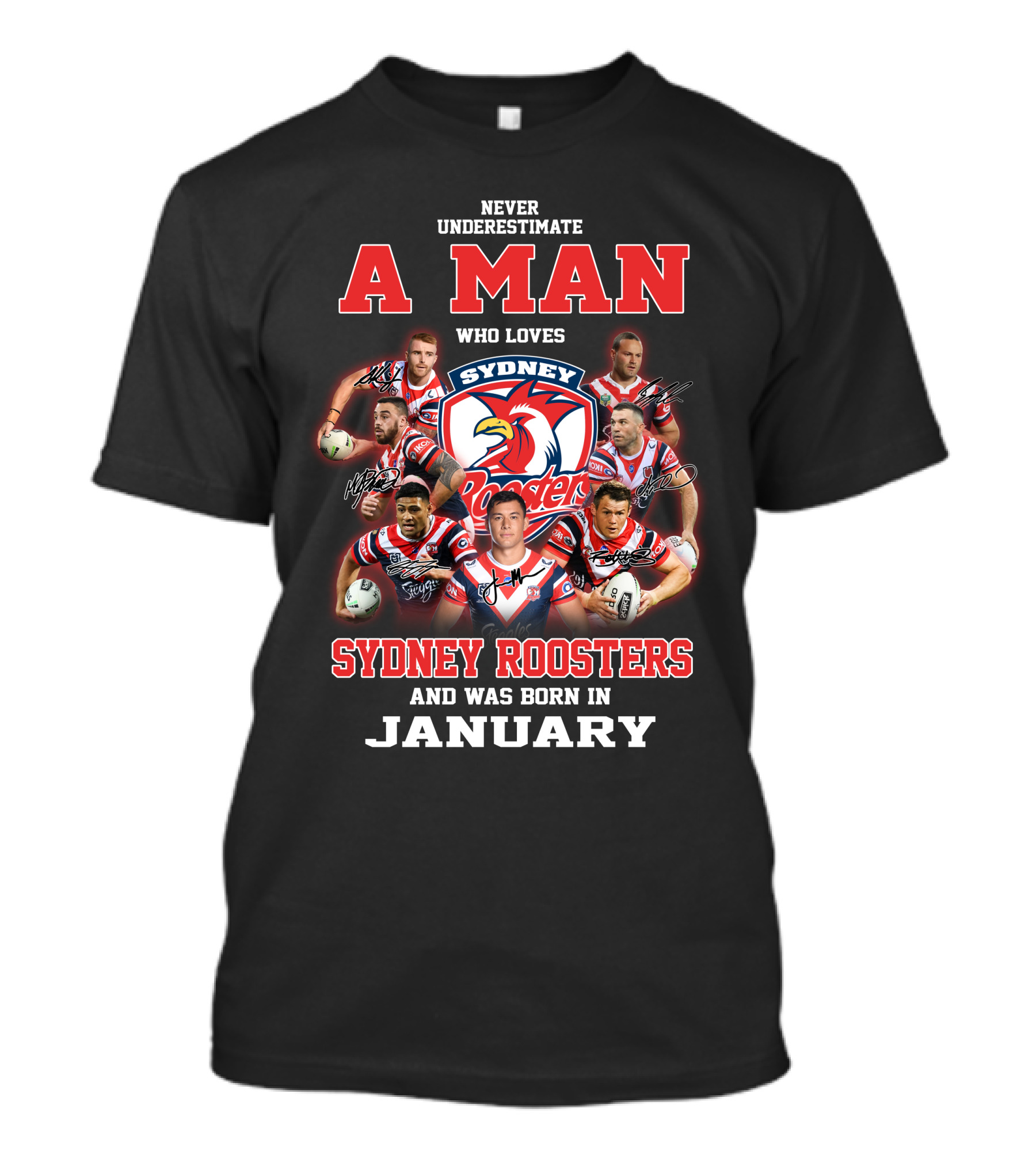 The Never Underestimate a Man Who Loves Sydney Roosters and Was Born in January T-shirt is designed for everyday wear and a consistent fit. Fabric is pre-shrunk ring-spun cotton with durable stitching. See the size chart below for exact measurements.