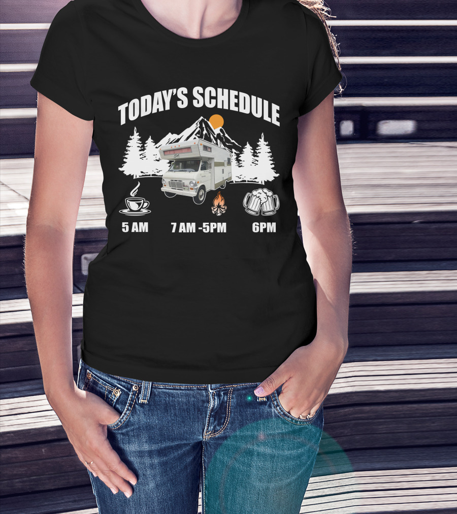 Today's Schedule Coffee Campfire Beer Forest Camper Mountain Sunrise T-Shirt