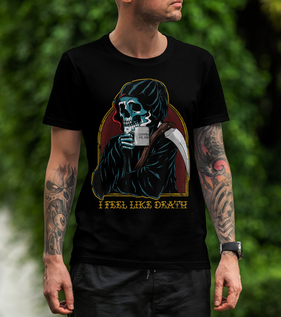 The I Feel Like Death Grim Reaper Skeleton Skull Coffee Or Die Java T-shirt is designed for everyday wear and a consistent fit. Fabric is pre-shrunk ring-spun cotton with durable stitching. See the size chart below for exact measurements.