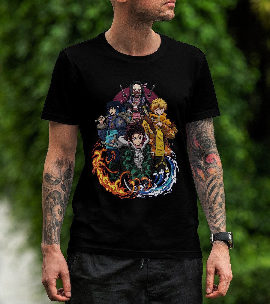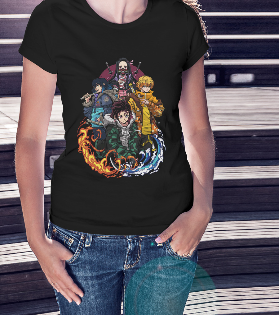 Kimetsu No Yaiba Demon Slayer Tanjiro Nezuko Zenitsu Inosuke Elemental Power Poses T-Shirt