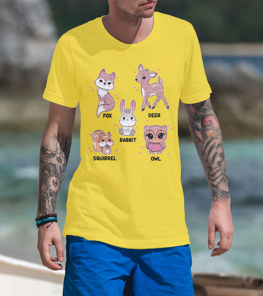The Fox Deer Rabbit Squirrel Owl Cute Animals T-shirt is designed for everyday wear and a consistent fit. Fabric is pre-shrunk ring-spun cotton with durable stitching. See the size chart below for exact measurements.