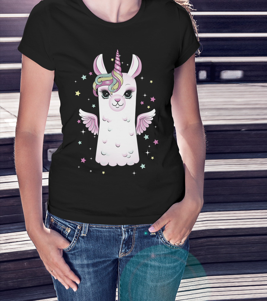Llama Unicorn With Rainbow Mane And Wings Surrounded By Stars T-Shirt