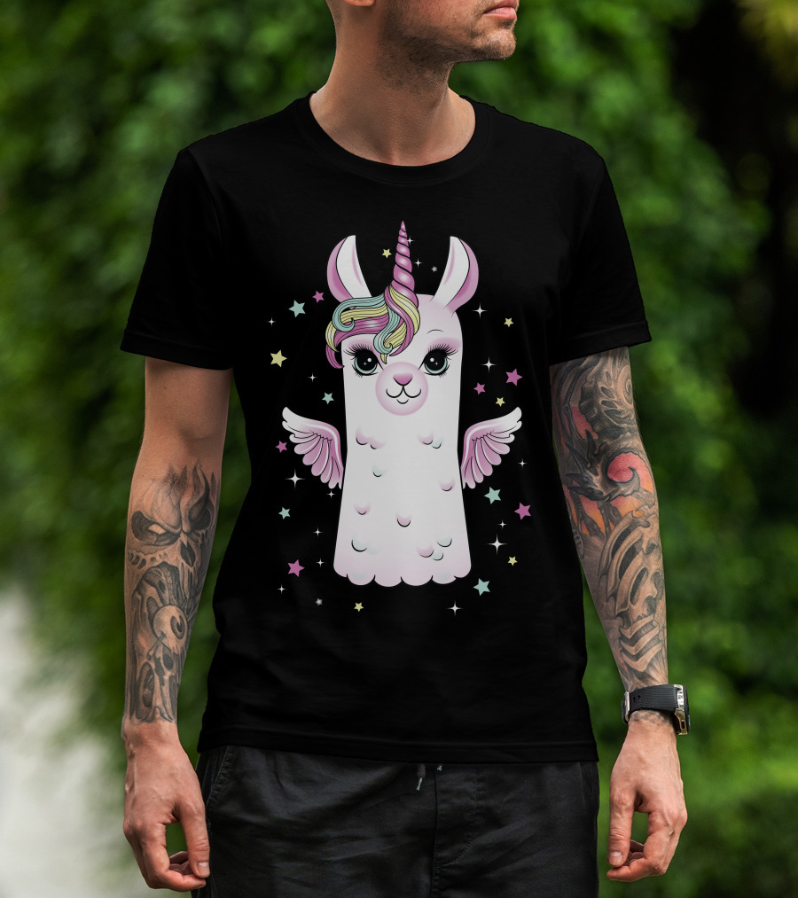 The Llama Unicorn with Rainbow Mane and Wings Surrounded by Stars T-shirt is designed for everyday wear and a consistent fit. Fabric is pre-shrunk ring-spun cotton with durable stitching. See the size chart below for exact measurements.