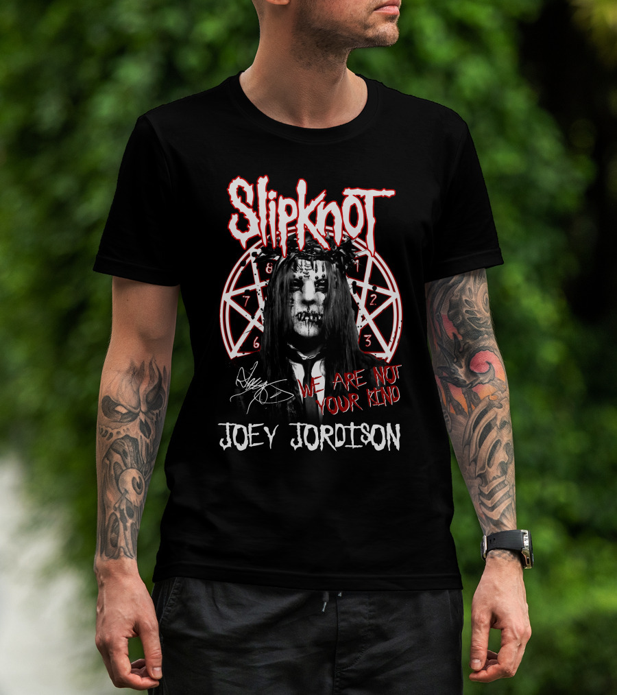 The Slipknot We Are Not Your Kind Joey Jordison T-shirt is designed for everyday wear and a consistent fit. Fabric is pre-shrunk ring-spun cotton with durable stitching. See the size chart below for exact measurements.