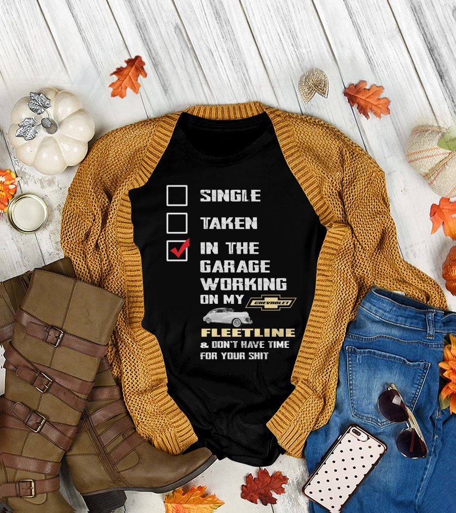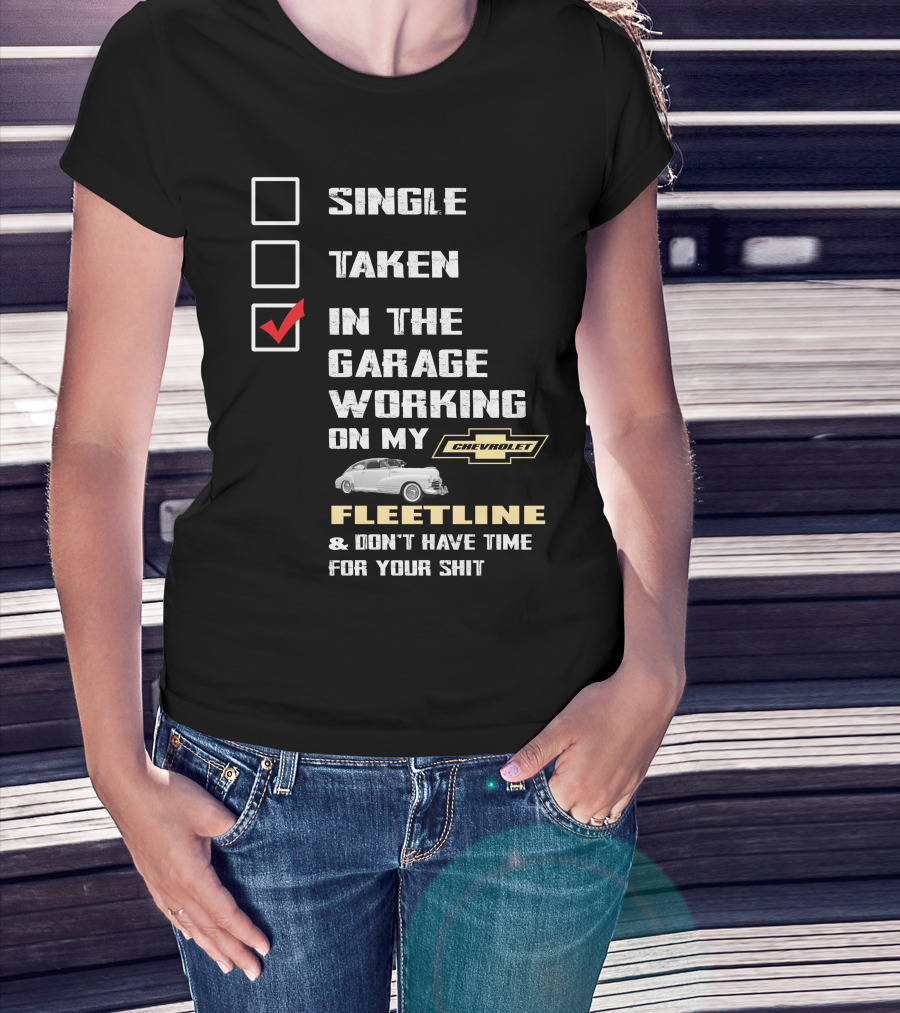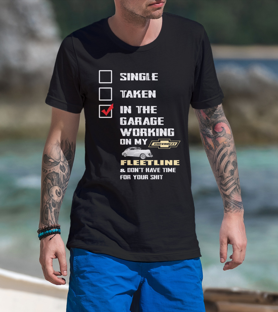 The SINGLE TAKEN IN THE GARAGE WORKING ON MY CHEVROLET FLEETLINE and DON'T HAVE TIME FOR YOUR SHIT T-shirt is designed for everyday wear and a consistent fit. Fabric is pre-shrunk ring-spun cotton with durable stitching. See the size chart below for exact measurements.