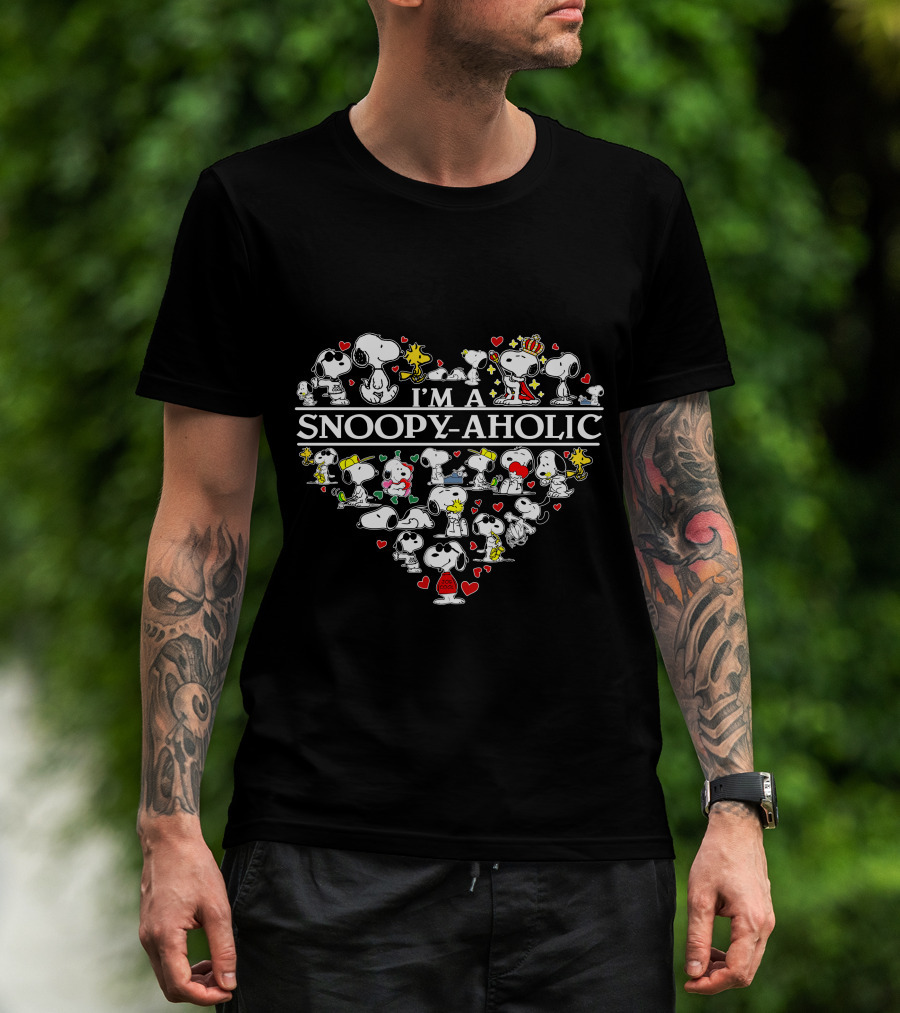 I'm A Snoopy-Aholic Peanuts Heart Collage Of Snoopy And Woodstock With Love Hearts T-Shirt
