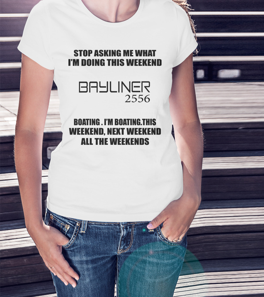 The STOP ASKING ME WHAT I'M DOING THIS WEEKEND BAYLINER 2556 BOATING THIS WEEKEND NEXT WEEKEND ALL THE WEEKENDS T-shirt is designed for everyday wear and a consistent fit. Fabric is pre-shrunk ring-spun cotton with durable stitching. See the size chart below for exact measurements.