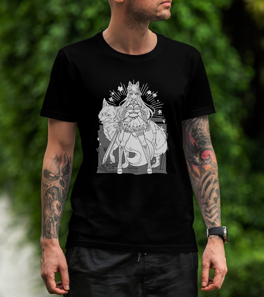The Shark Robot Silvervale Vshojo Warrior with Wolf Companion T-shirt is designed for everyday wear and a consistent fit. Fabric is pre-shrunk ring-spun cotton with durable stitching. See the size chart below for exact measurements.