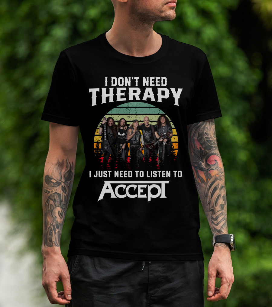 The I Don't Need Therapy I Just Need to Listen to Accept Vintage Band Image T-shirt is designed for everyday wear and a consistent fit. Fabric is pre-shrunk ring-spun cotton with durable stitching. See the size chart below for exact measurements.