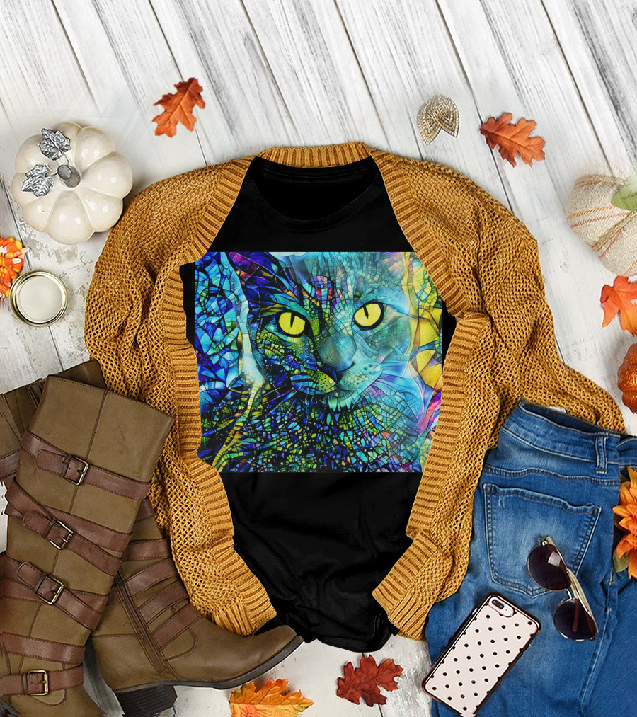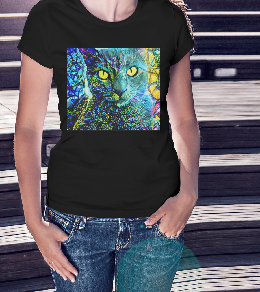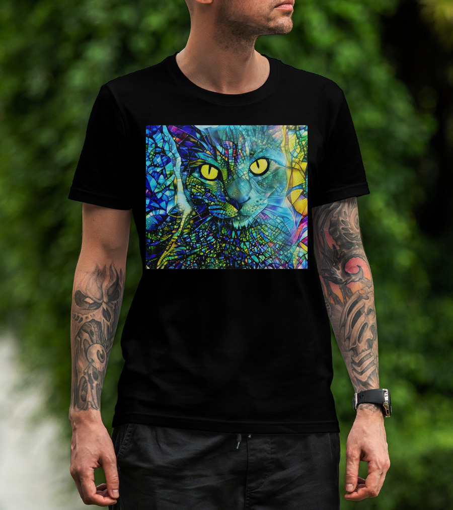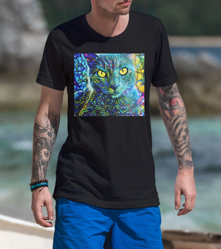 Cochfdhfdhfdh Stained Glass Mosaic Cat With Vibrant Yellow Eyes T-Shirt