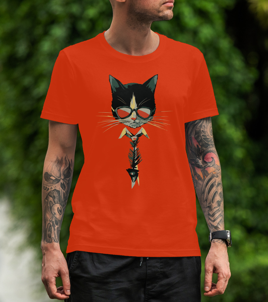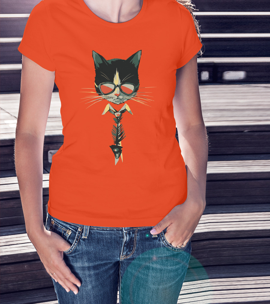 Bibisama CAT With Sunglasses And Fish Skeleton Tie T-Shirt
