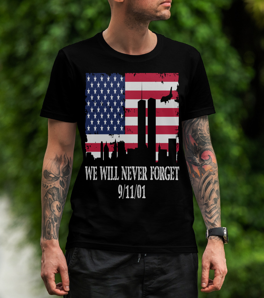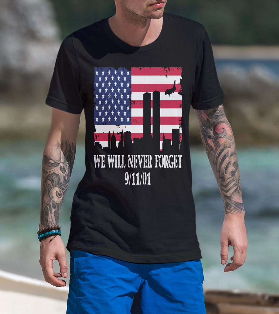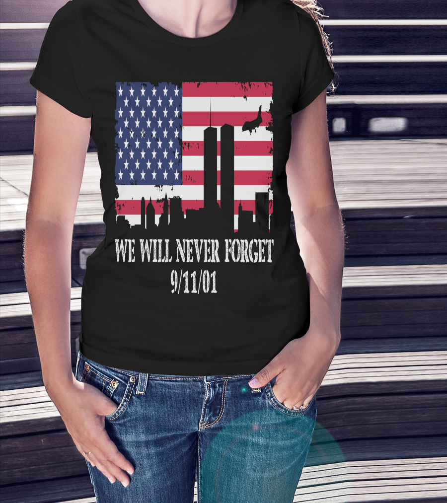 WE WILL NEVER FORGET 9/11/01 AMERICAN FLAG TWIN TOWERS T-Shirt