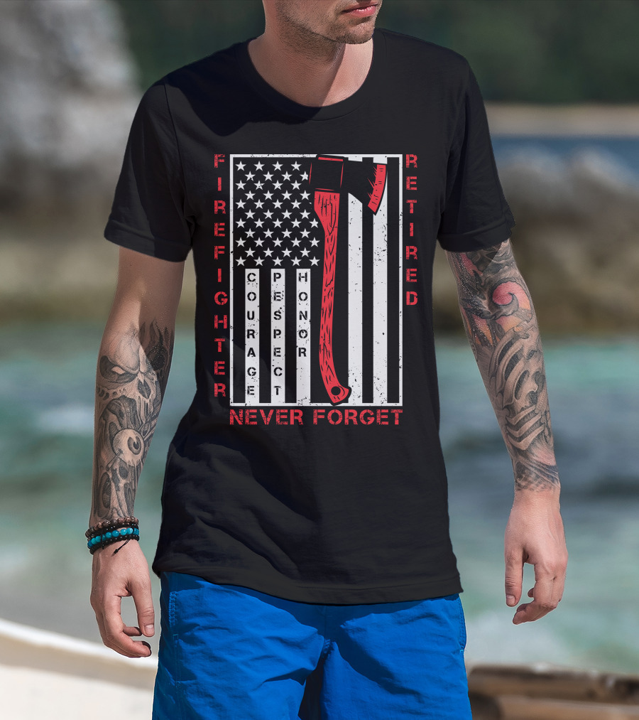 Firefighter Retired Courage Respect Honor Never Forget 9.11 Axe American Flag T-Shirt