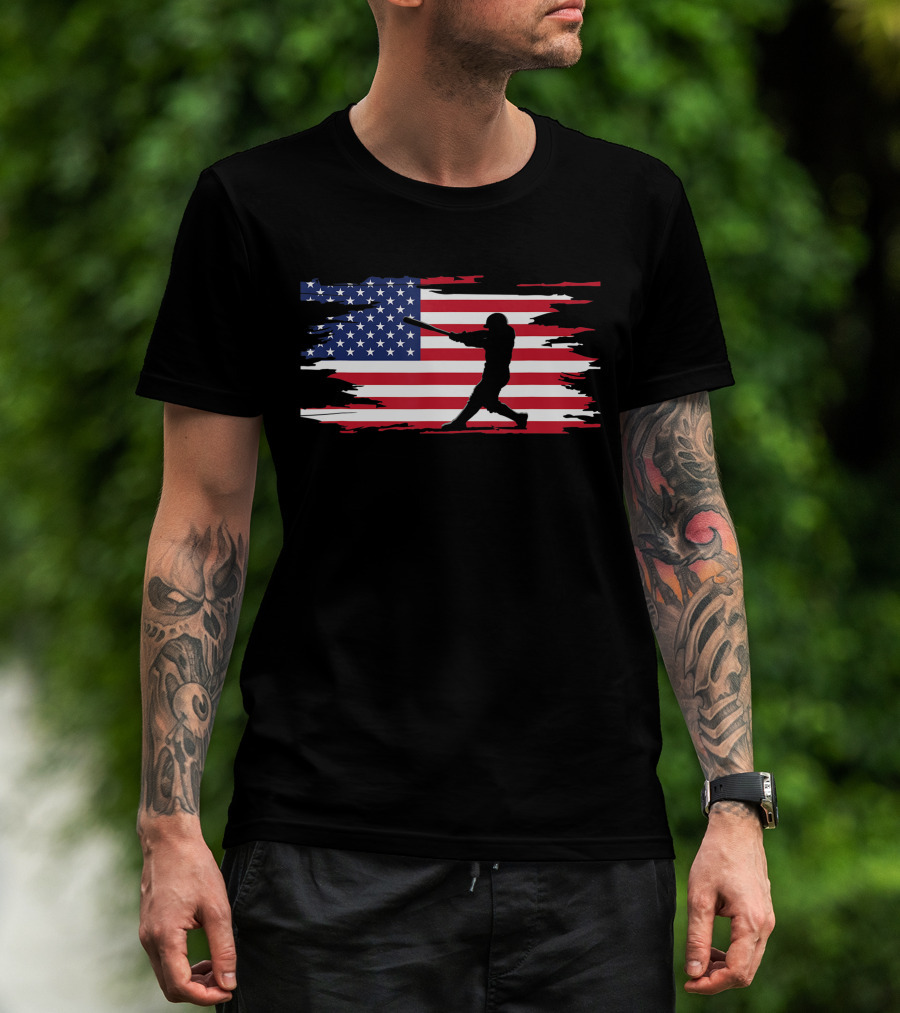American Flag Baseball Player Silhouette Patriotic Sports T-Shirt