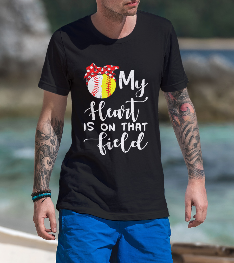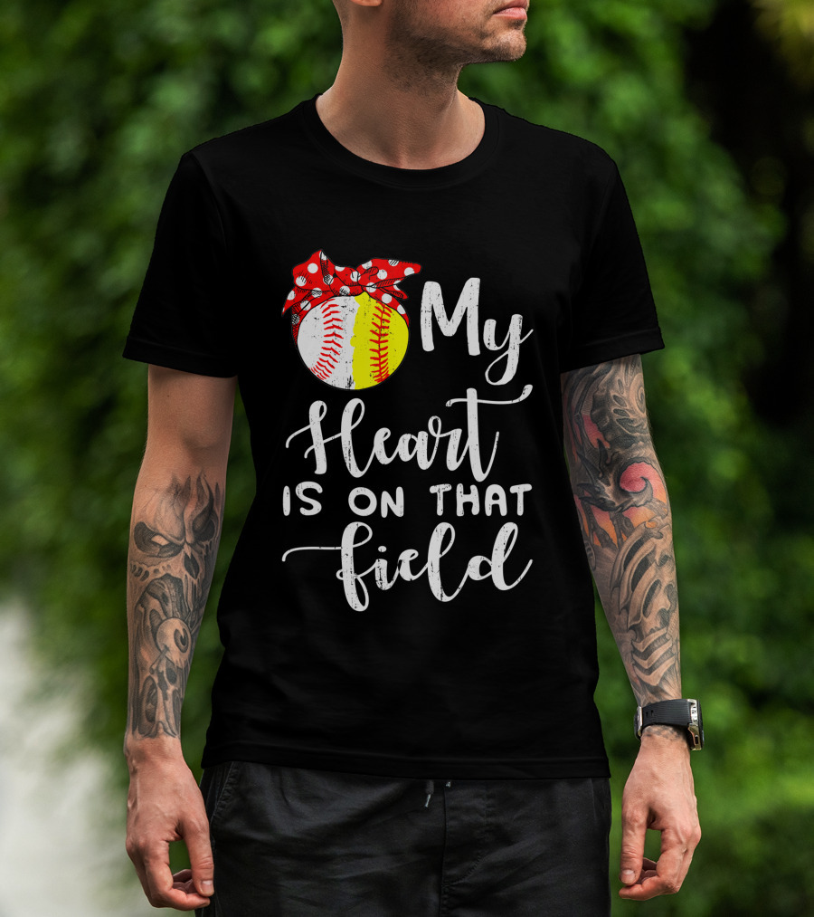 My Heart Is On That Field Baseball Softball Red Polka Dot Bow T-Shirt