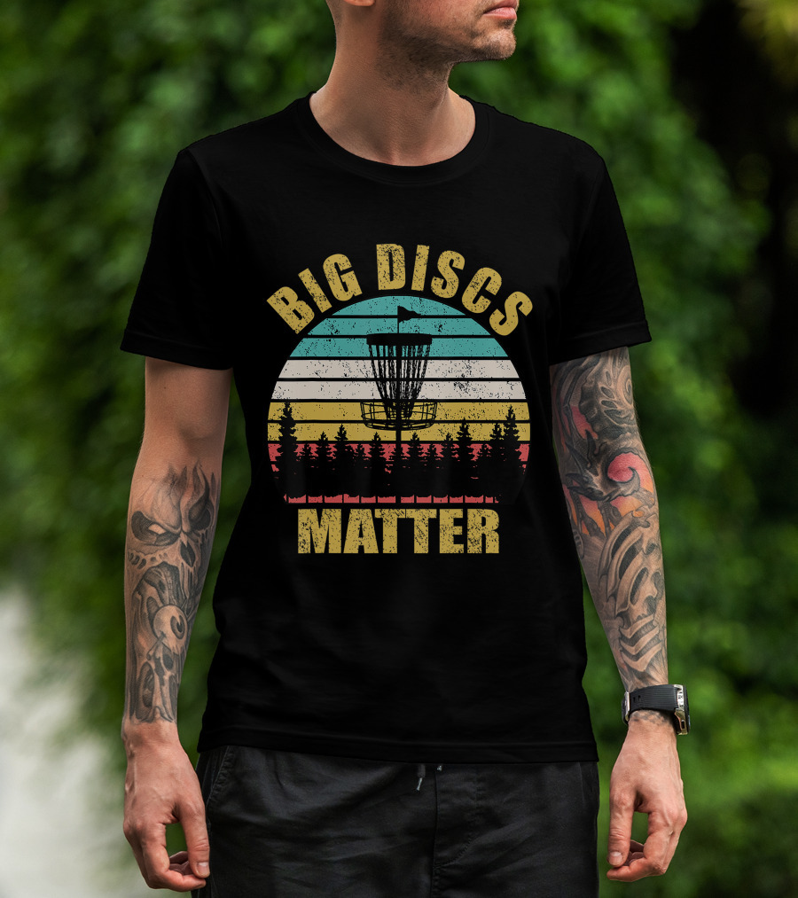 The Big Discs Matter Funny Frisbee Golf Retro Sunforest Striped T-shirt is designed for everyday wear and a consistent fit. Fabric is pre-shrunk ring-spun cotton with durable stitching. See the size chart below for exact measurements.