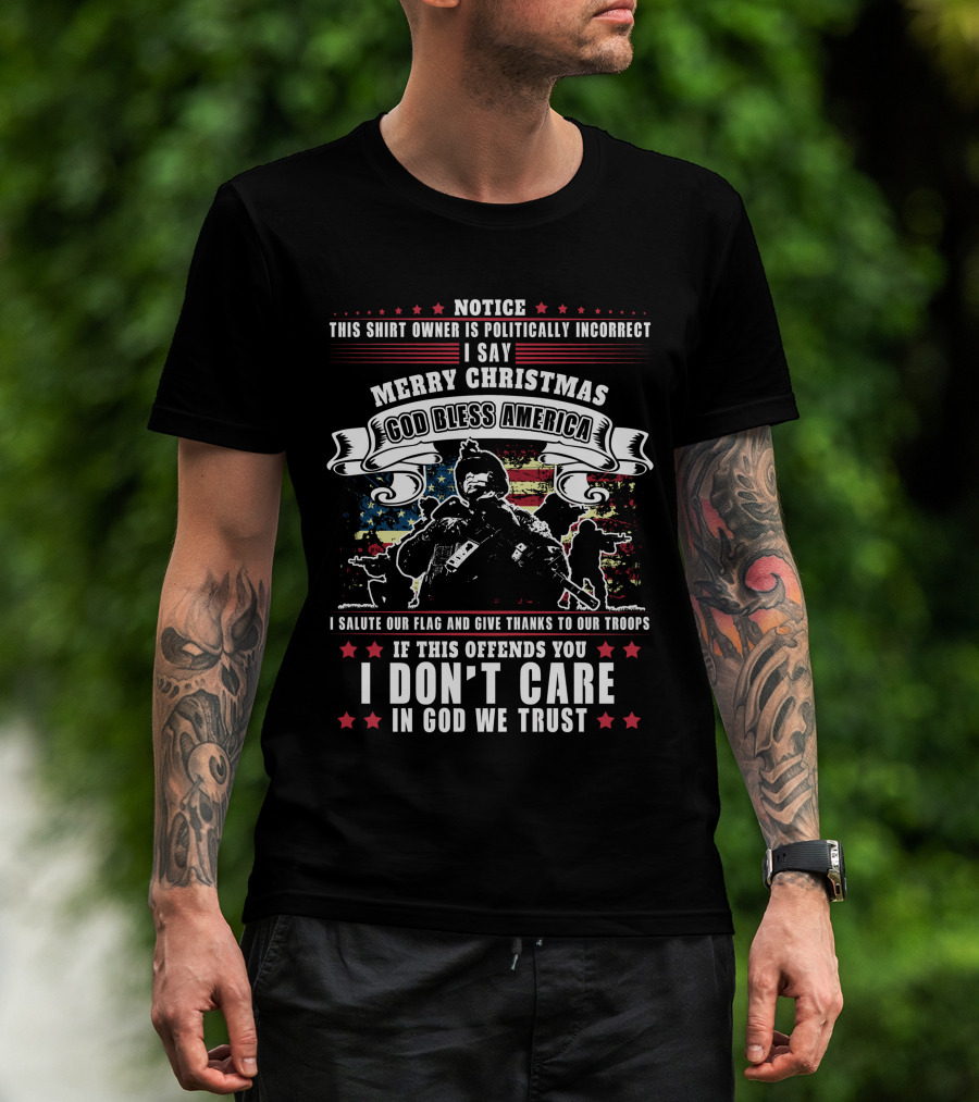 Notice This Shirt Owner Is Politically Incorrect Merry Christmas God Bless America I Salute Our Flag And Troops I Don't Care In God We Trust T-Shirt