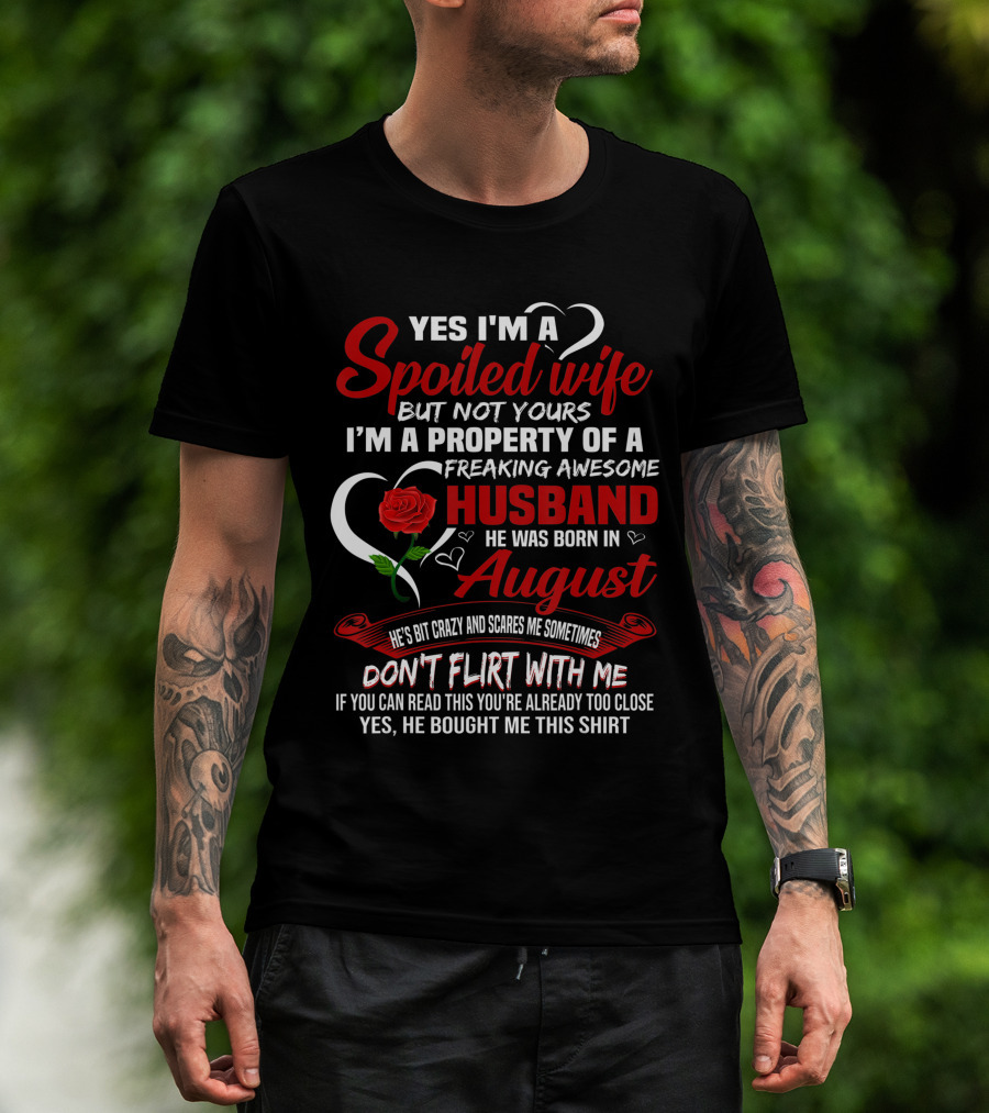 Yes I'm A Spoiled Wife But Not Yours Property Of A Freaking Awesome Husband Born In August Don't Flirt With Me If You Can Read This You're Too Close T-Shirt