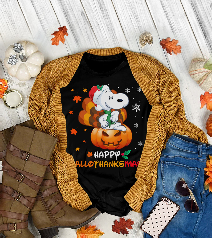 Happy Hallothanksmas Snoopy Christmas Pumpkin Turkey Leaves Snowflakes T-Shirt