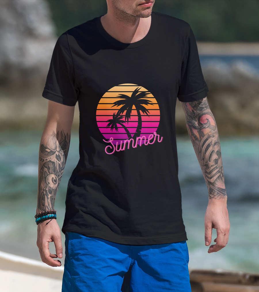 The Summer Sunset Palm Trees Vintage Retro T-shirt is designed for everyday wear and a consistent fit. Fabric is pre-shrunk ring-spun cotton with durable stitching. See the size chart below for exact measurements.