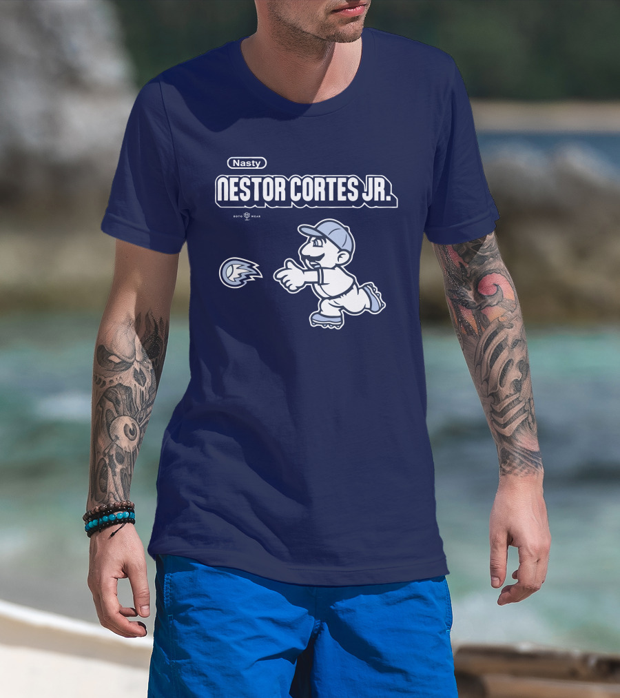 The Nasty Nestor Cortes Jr. Cartoon Baseball New York Roto Wear T-shirt is designed for everyday wear and a consistent fit. Fabric is pre-shrunk ring-spun cotton with durable stitching. See the size chart below for exact measurements.