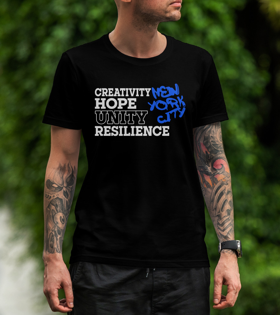 The Creativity Hope Unity Resilience New York City T-shirt is designed for everyday wear and a consistent fit. Fabric is pre-shrunk ring-spun cotton with durable stitching. See the size chart below for exact measurements.