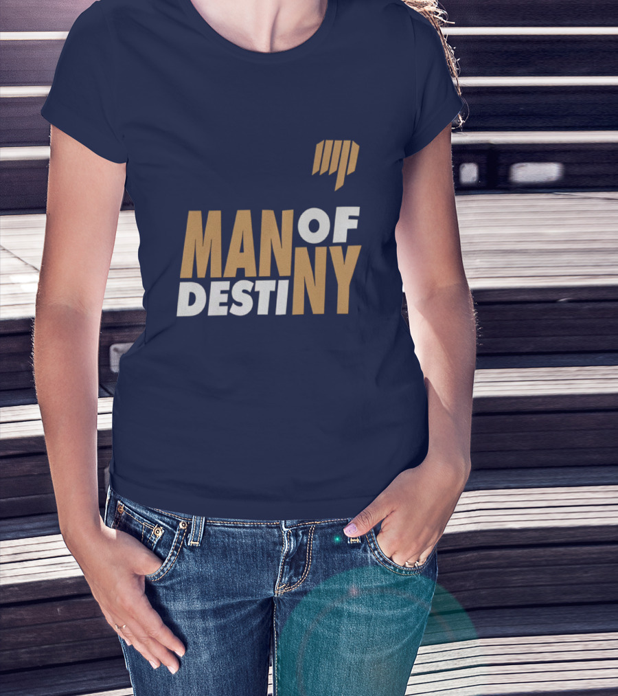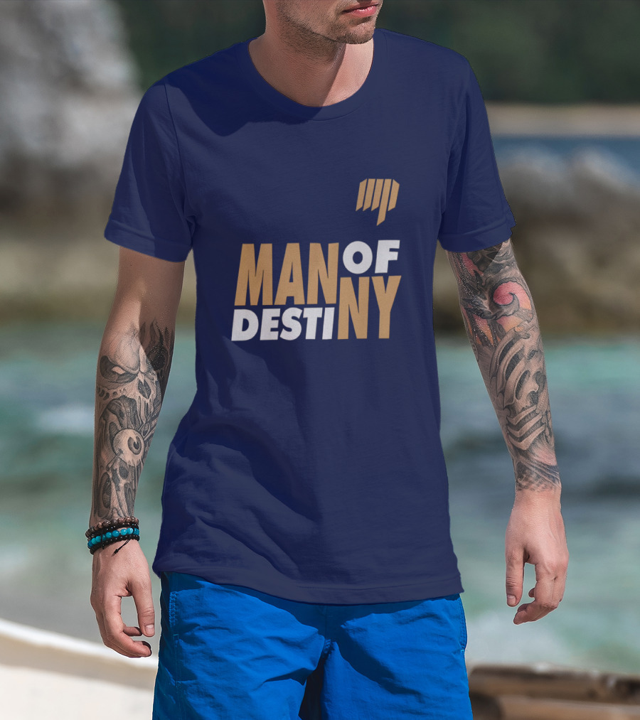 The Man of Destiny Blue and Gold Text with Vertical Stripe T-shirt is designed for everyday wear and a consistent fit. Fabric is pre-shrunk ring-spun cotton with durable stitching. See the size chart below for exact measurements.