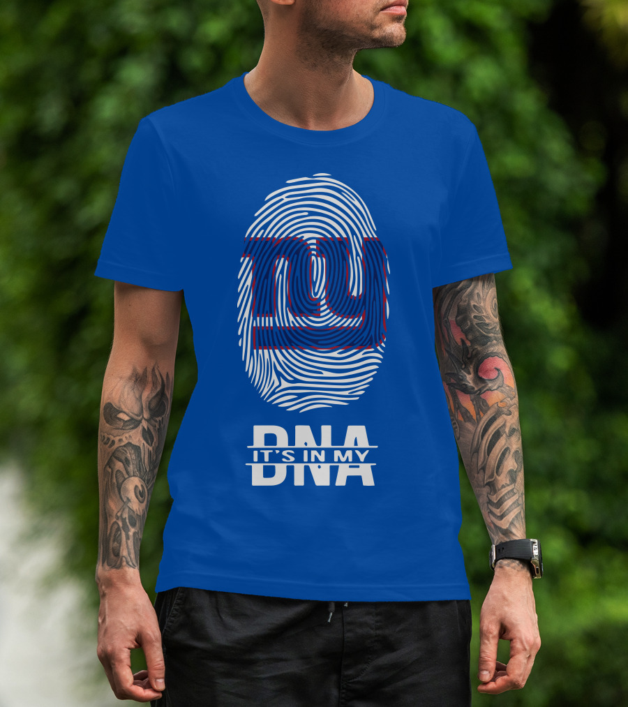 The New York Giants Fingerprint Logo It's In My DNA T-shirt is designed for everyday wear and a consistent fit. Fabric is pre-shrunk ring-spun cotton with durable stitching. See the size chart below for exact measurements.