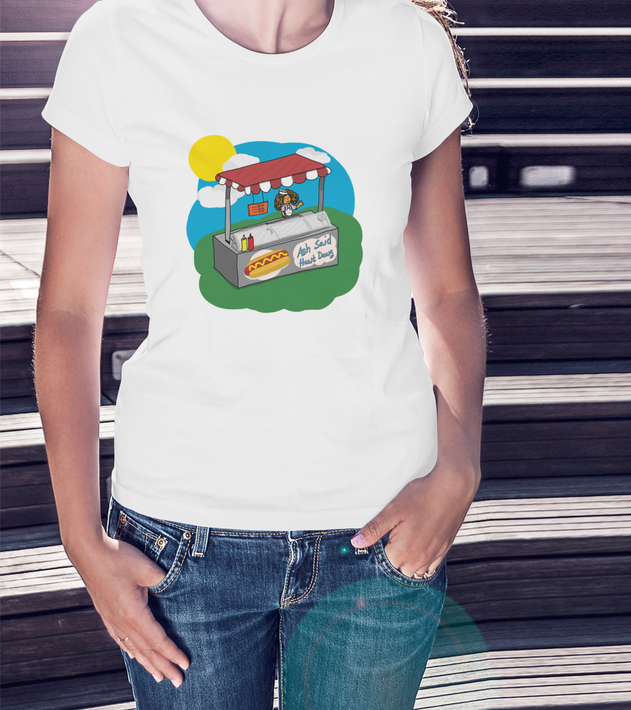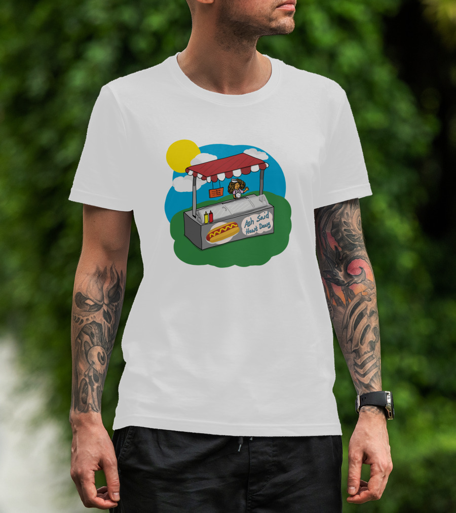 Ash Said Hawt Dawg Stand With Hot Dog And Condiments Under Red Canopy In Cartoon T-Shirt