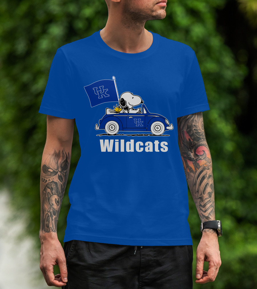 Snoopy Driving Kentucky Wildcats Car With Woodstock And UK Flag T-Shirt