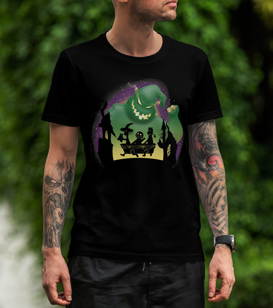 Boogie Lock Shock And Barrel Silhouette Against Green Monster And Haunted House Background T-Shirt