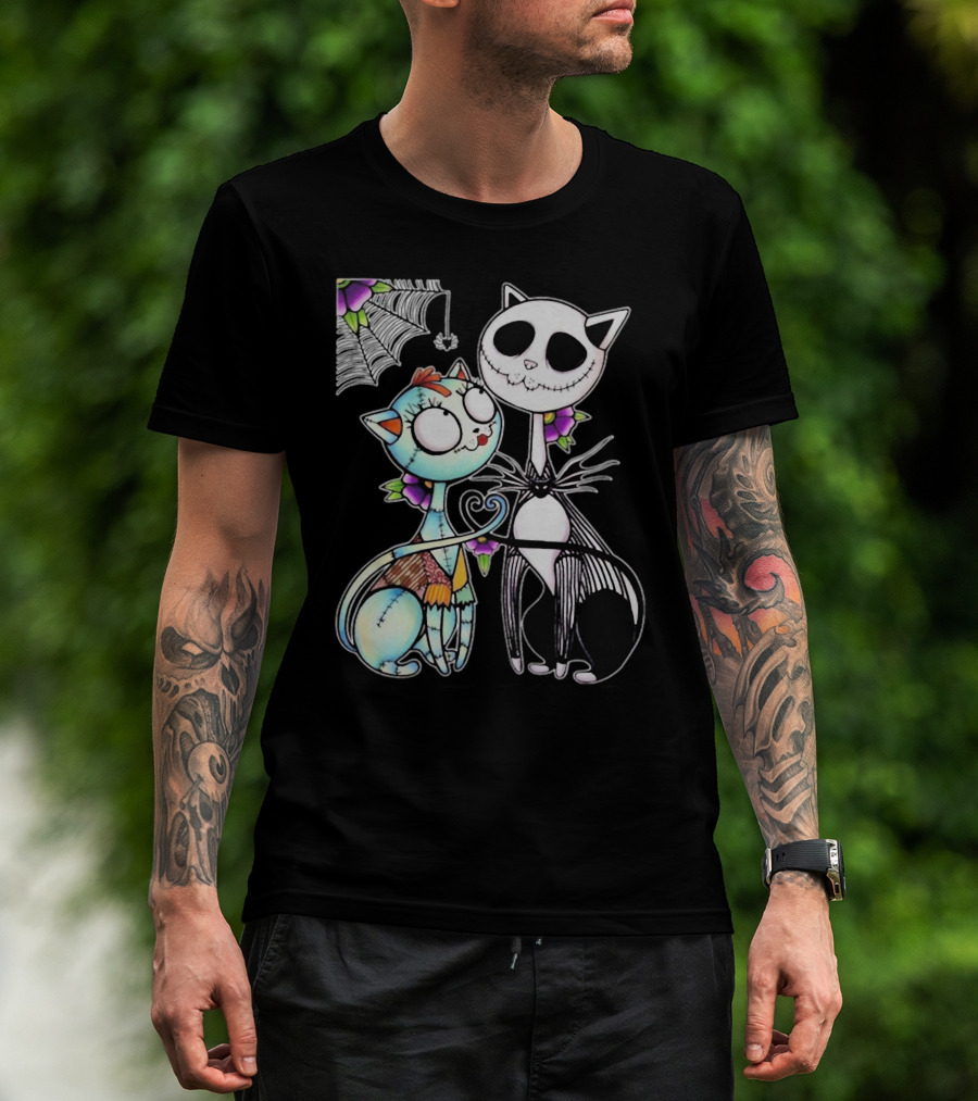 Jack Skellington Cat And Sally Cat With Heart Umbrella And Stitching Elements T-Shirt
