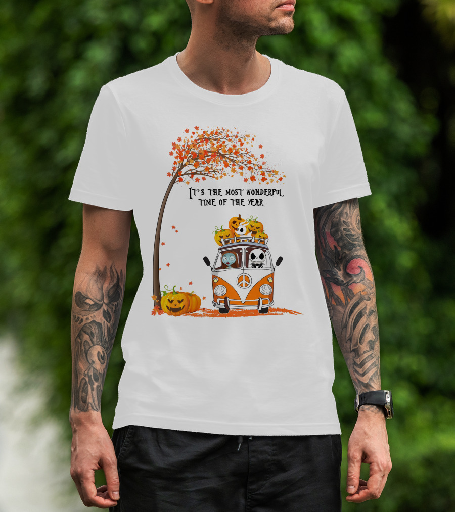 It's The Most Wonderful Time Of The Year Jack Sally Zero And Pumpkin In Van With Tree And Autumn Leaves T-Shirt