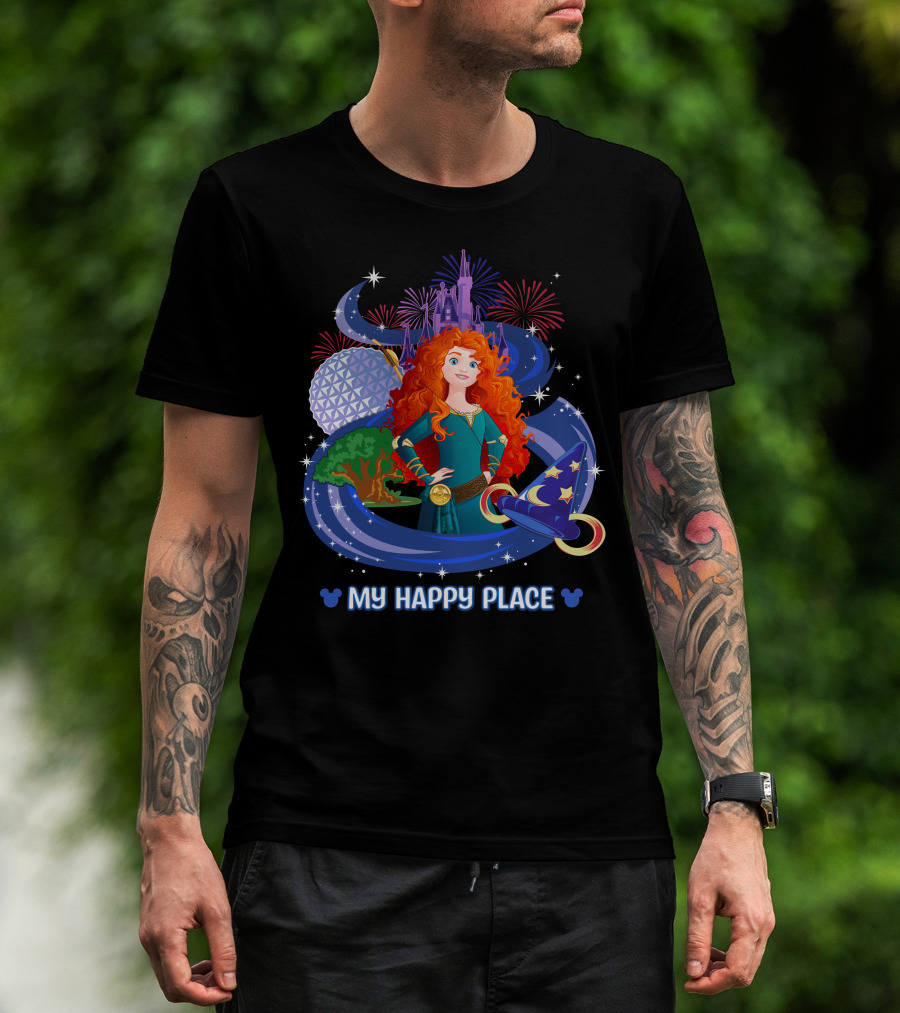 The MY HAPPY PLACE MERIDA T-shirt is designed for everyday wear and a consistent fit. Fabric is pre-shrunk ring-spun cotton with durable stitching. See the size chart below for exact measurements.