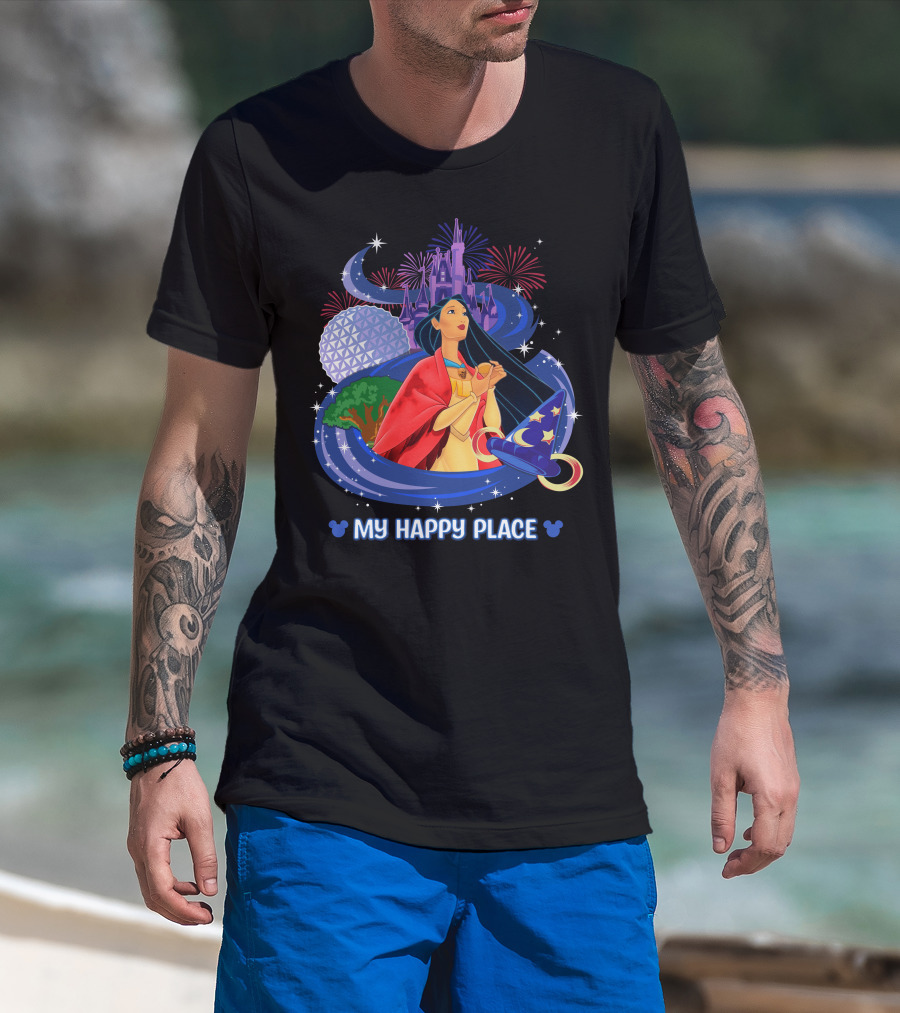 MY HAPPY PLACE POCAHONTAS DISNEY CASTLE EPCOT FIREWORKS SORCERER MICKEY HAT T-Shirt