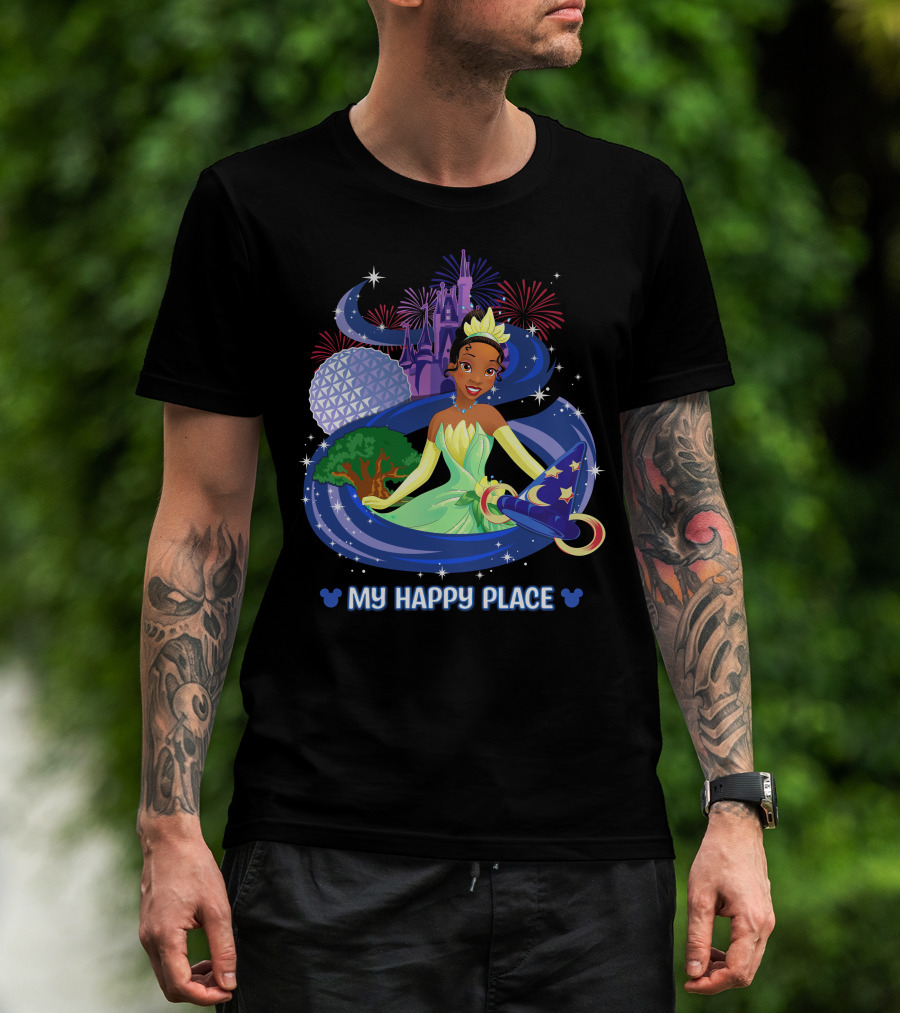 Tiana My Happy Place Disney Parks Epcot Fireworks Castle Sorcerer Hat T-Shirt