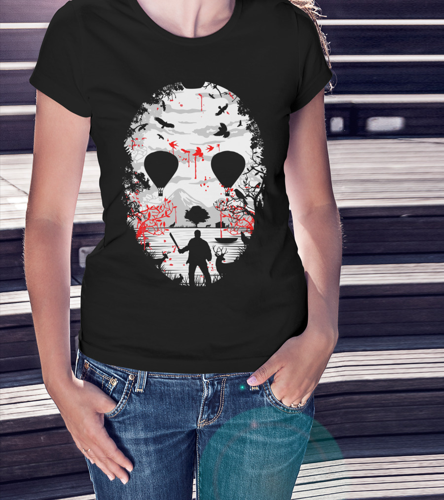 Jason Voorhees Camp Crystal Lake Mask Silhouette Counselor Scene T-Shirt