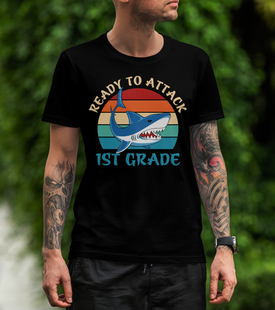 Ready To Attack 1st Grade Shark Retro Stripes T-Shirt