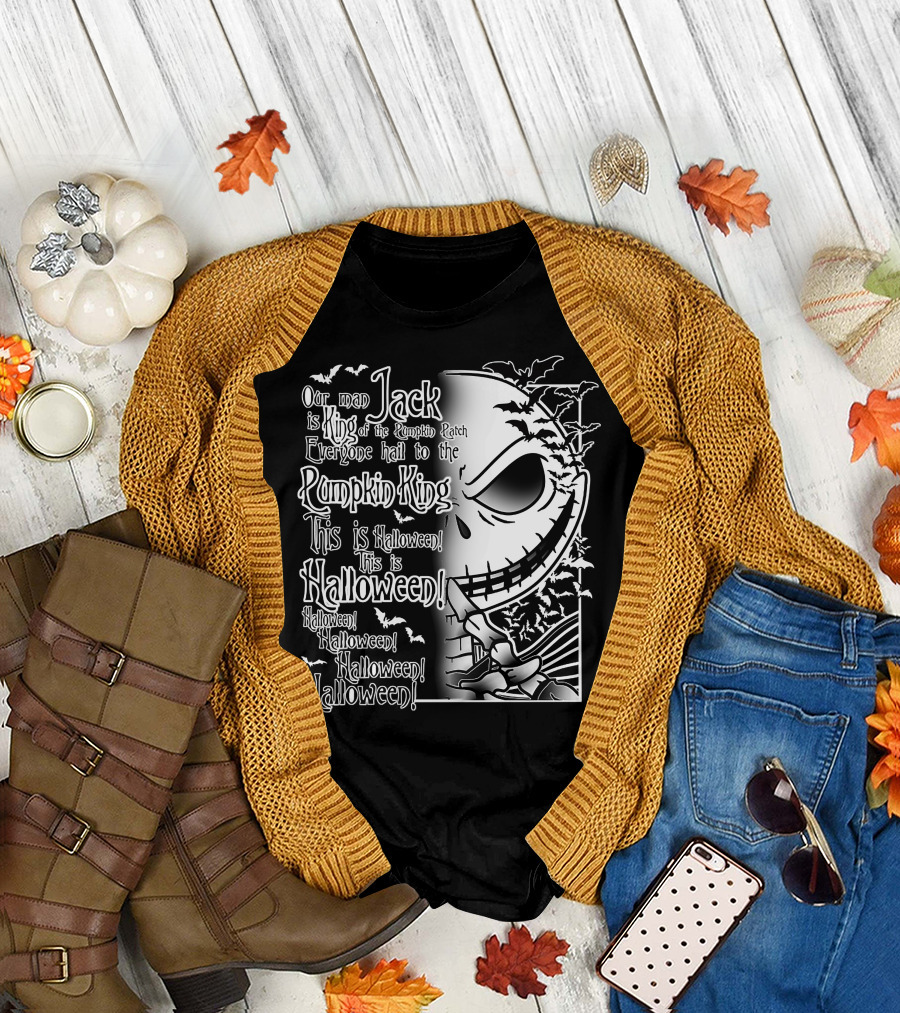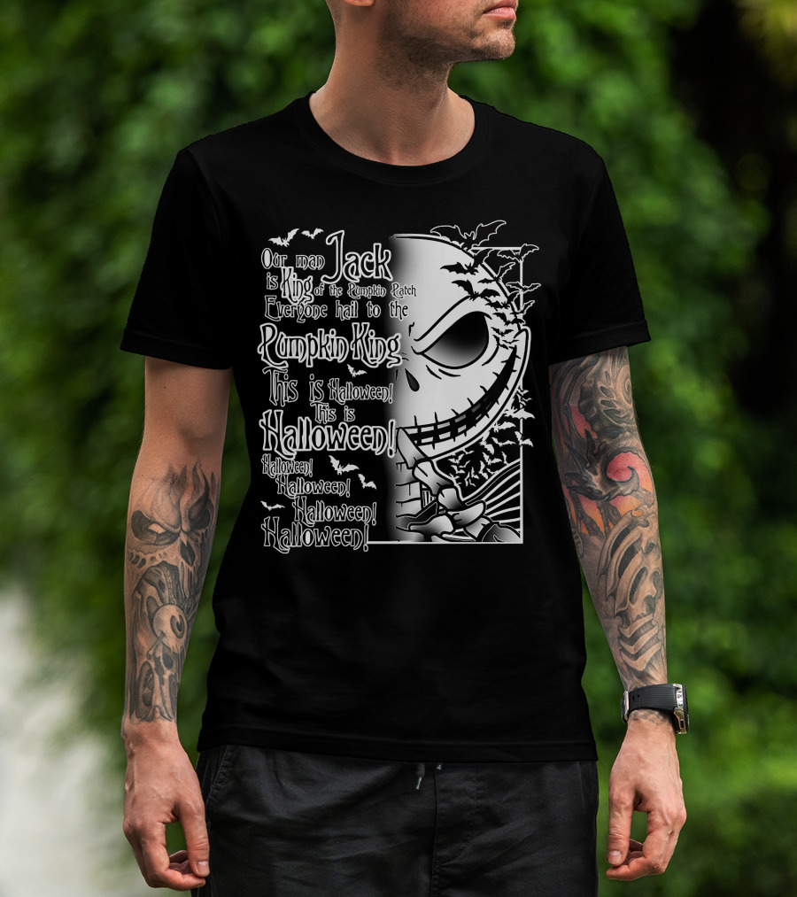 The Jack Pumpkin King Halloween This is Halloween Hail to the King T-shirt is designed for everyday wear and a consistent fit. Fabric is pre-shrunk ring-spun cotton with durable stitching. See the size chart below for exact measurements.