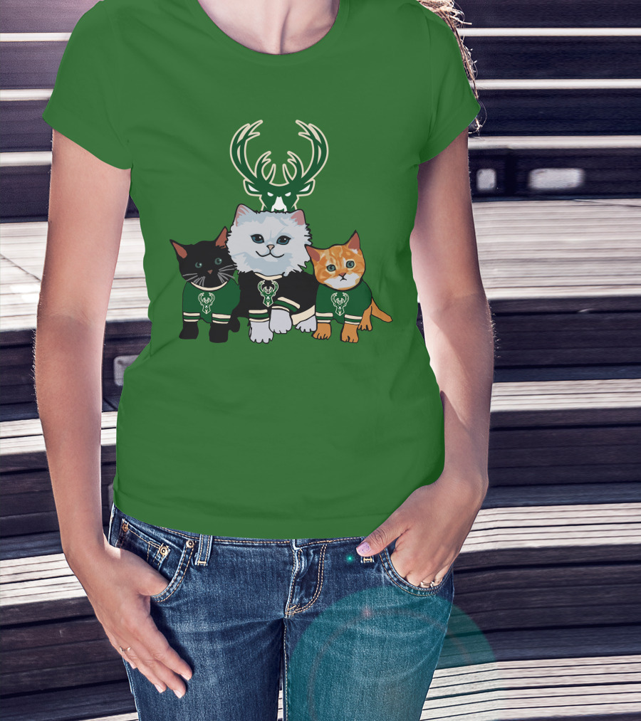 Milwaukee Bucks Cats Trio With Team Logos And Deer Antlers T-Shirt