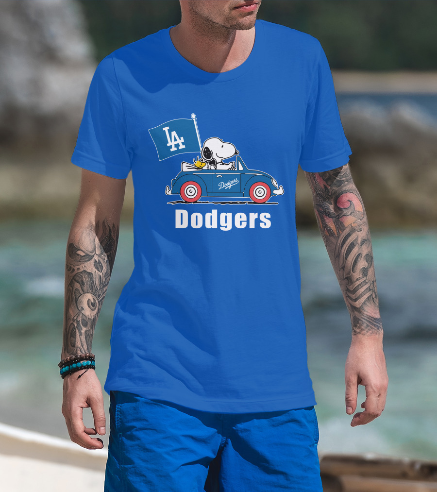 Dodgers Snoopy Woodstock Driving Car LA Flag T-Shirt