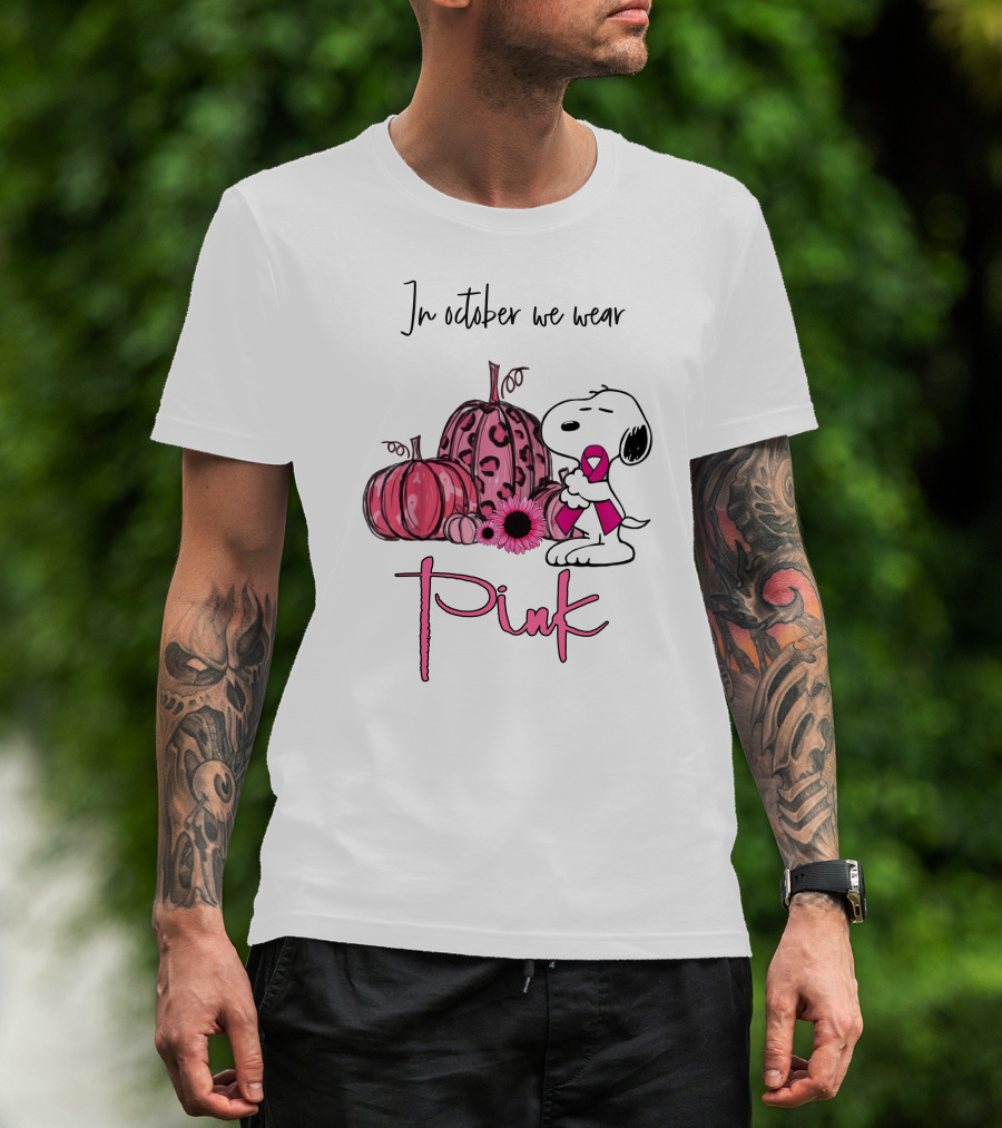 In October We Wear Pink With Peanuts Character Holding Ribbon And Pumpkins T-Shirt