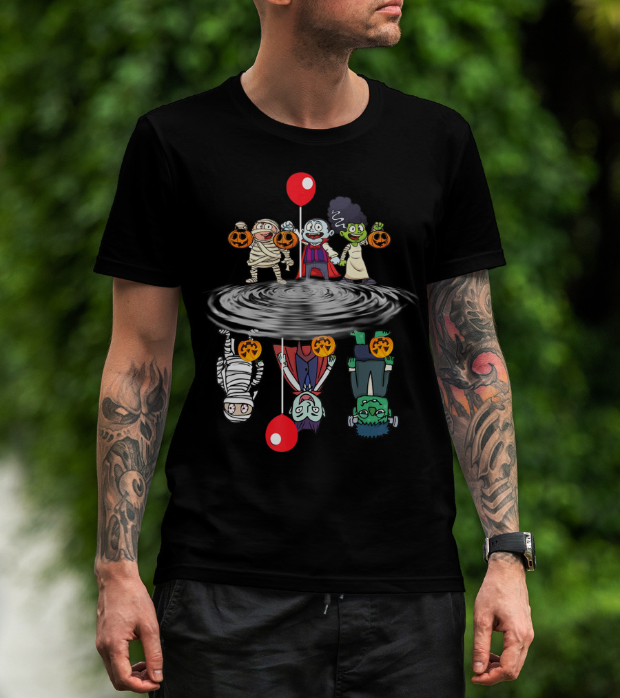 Halloween Horror Characters Reflection In Water With Red Balloons T-Shirt
