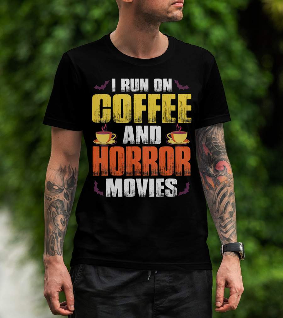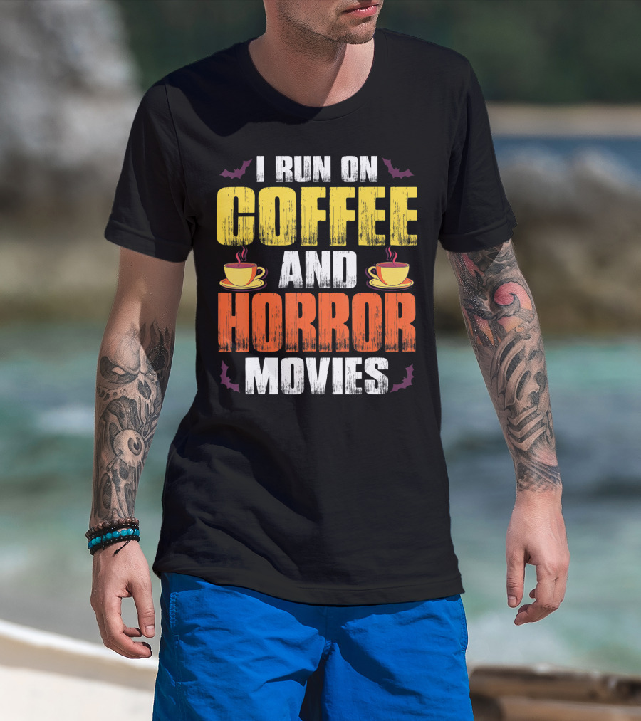 I Run On Coffee And Horror Movies Halloween Theme With Coffee Cups And Bats T-Shirt