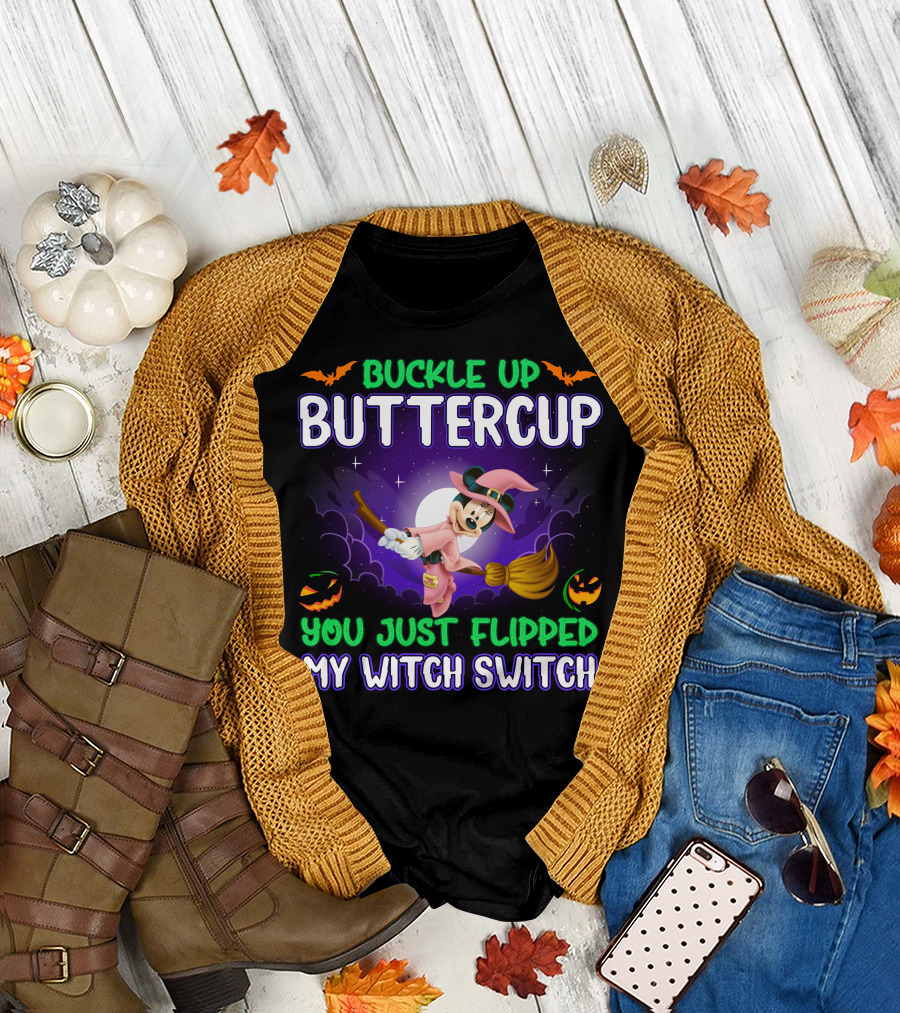 Buckle Up Buttercup You Just Flipped My Witch Switch Minnie Halloween Broomstick Pumpkins T-Shirt