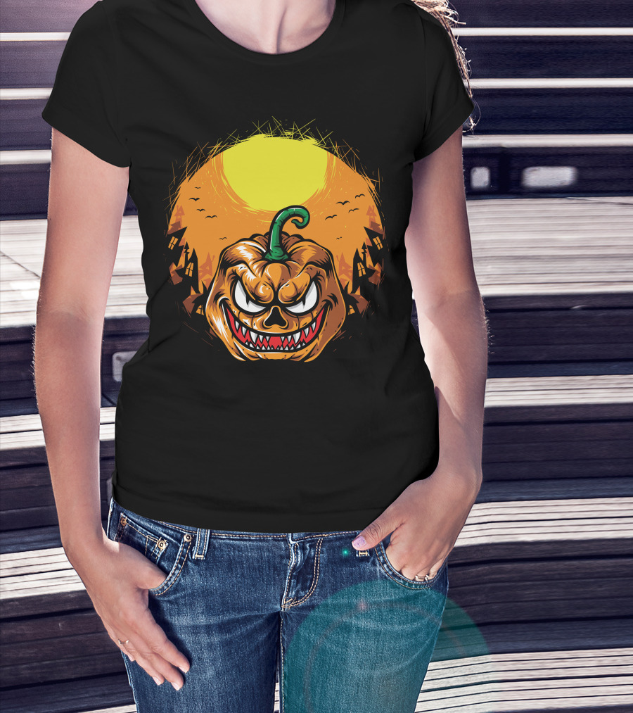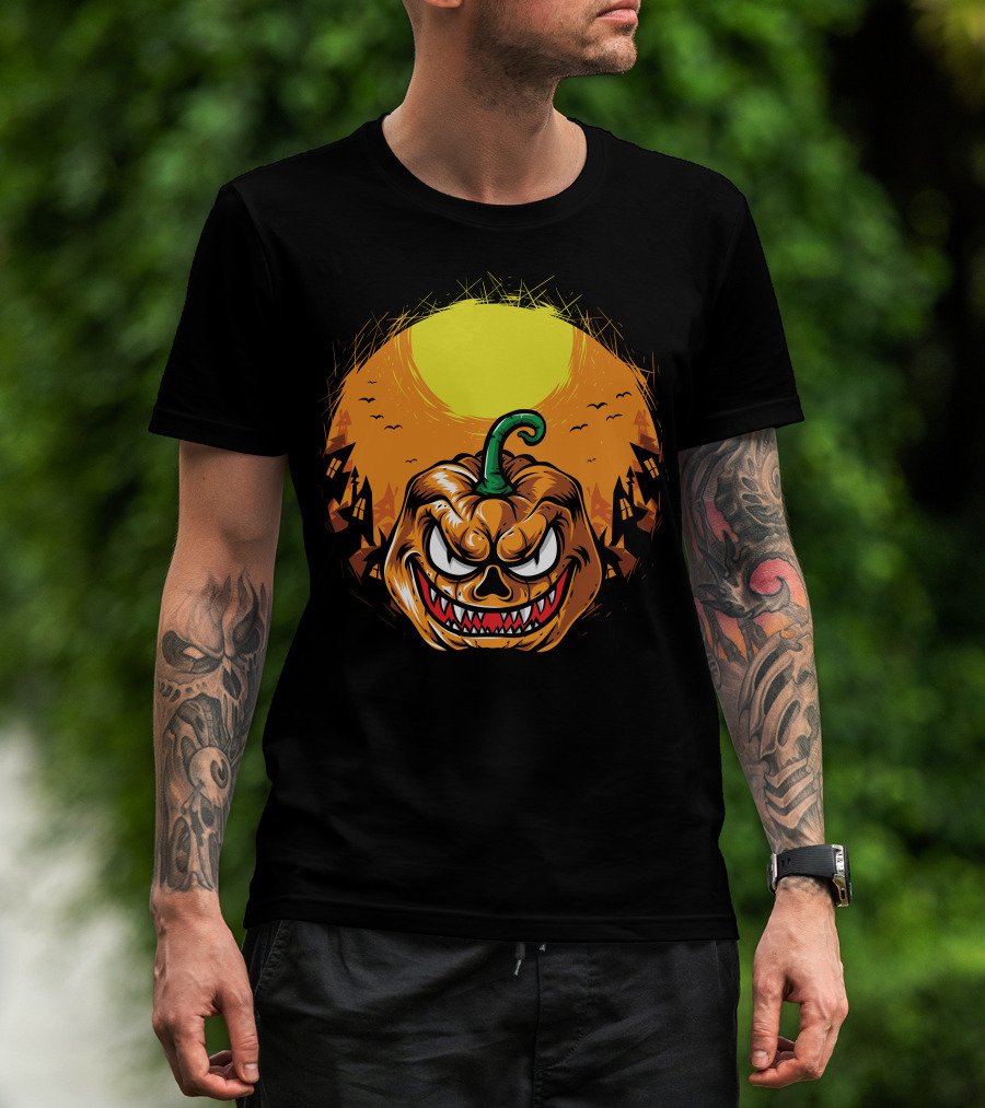 The Spooky Grinning Pumpkin with Haunted Houses and Bats under Full Moon Halloween T-shirt is designed for everyday wear and a consistent fit. Fabric is pre-shrunk ring-spun cotton with durable stitching. See the size chart below for exact measurements.